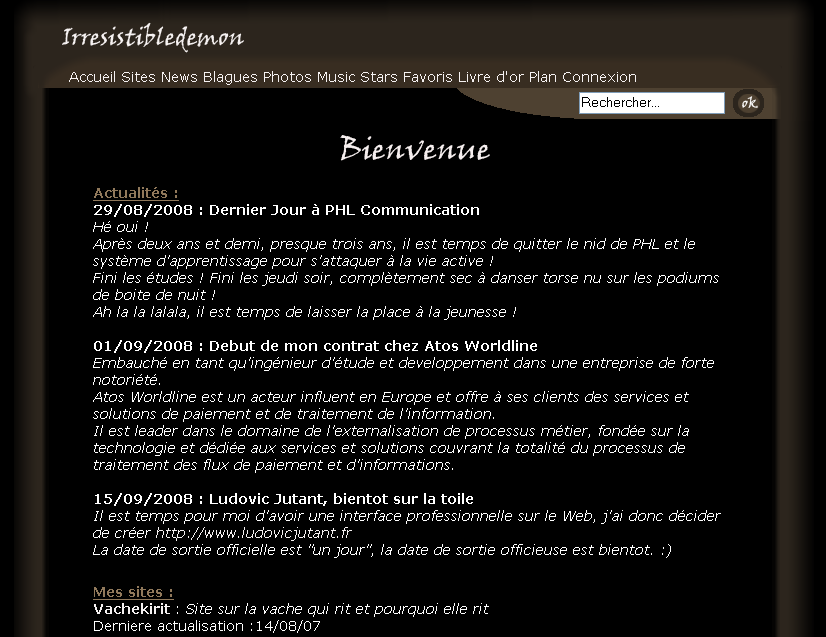 Irresistibledemon Portail Trip est mon site personnel. Il pourrait s'apparenté à un Blog. Il permet de rester en contact avec des amis éloignés et partager mes actualités du moment ainsi que des photos, des commentaires, et des indications sur des évènements (Par exemple : organisation du premier de l'an, plan d'accès, nombre de personne, menu, etc...)