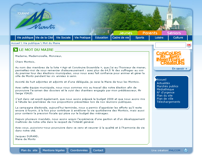 Le site de Monts permet à la ville de communiquer sur ses différentes actions et sur ses bilans. C'est un environement d'échange entre citoyen et services administratifs qui permet d'améliorer le cadre de vie, et d'informer la population sur les divers loisirs, sport et évènement culturel (dont le salon des jeunes inventeurs).