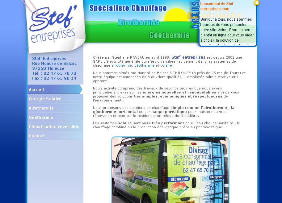 Stef-Entreprises est une SARL crée en avril 1998 et basée à Thilouze (25 min de Tours). C'est une entreprise d'électricité générale qui s'est diversifiée dans les domaines du chauffage airothermie, géothermie et le solaire.